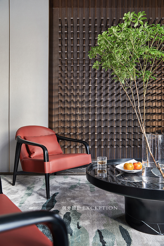 空間一角,幾枝青翠融入自然的生機,緋紅與典雅綠構成一幅和諧靜謐的畫面。肌理豐盈的山水紋幾面光影可鑒,賓客間談笑風生,來杯威士忌微醺空間的輕奢節奏,設計于細微之處關照商務精英的社交需求,獨特清靜的空間氣度也宛若天成。
