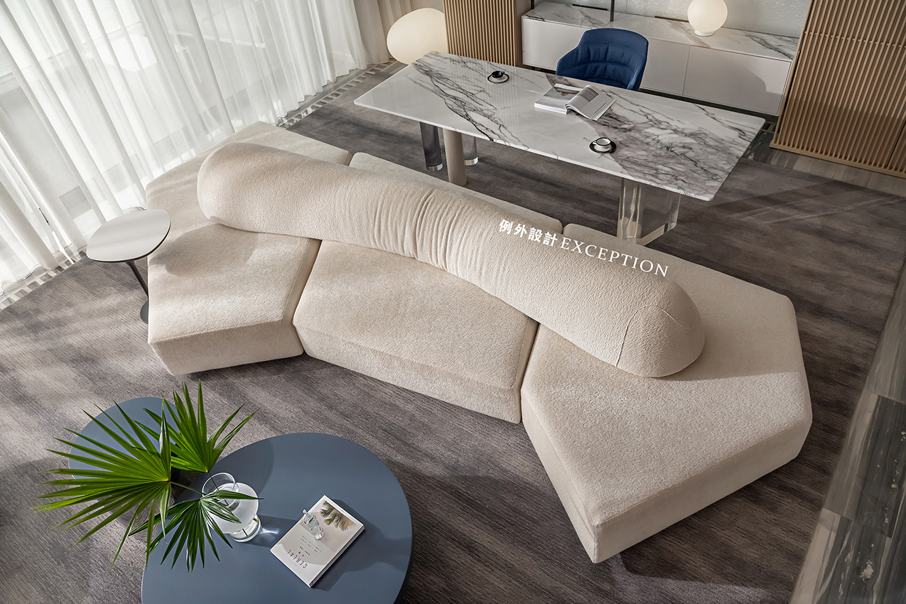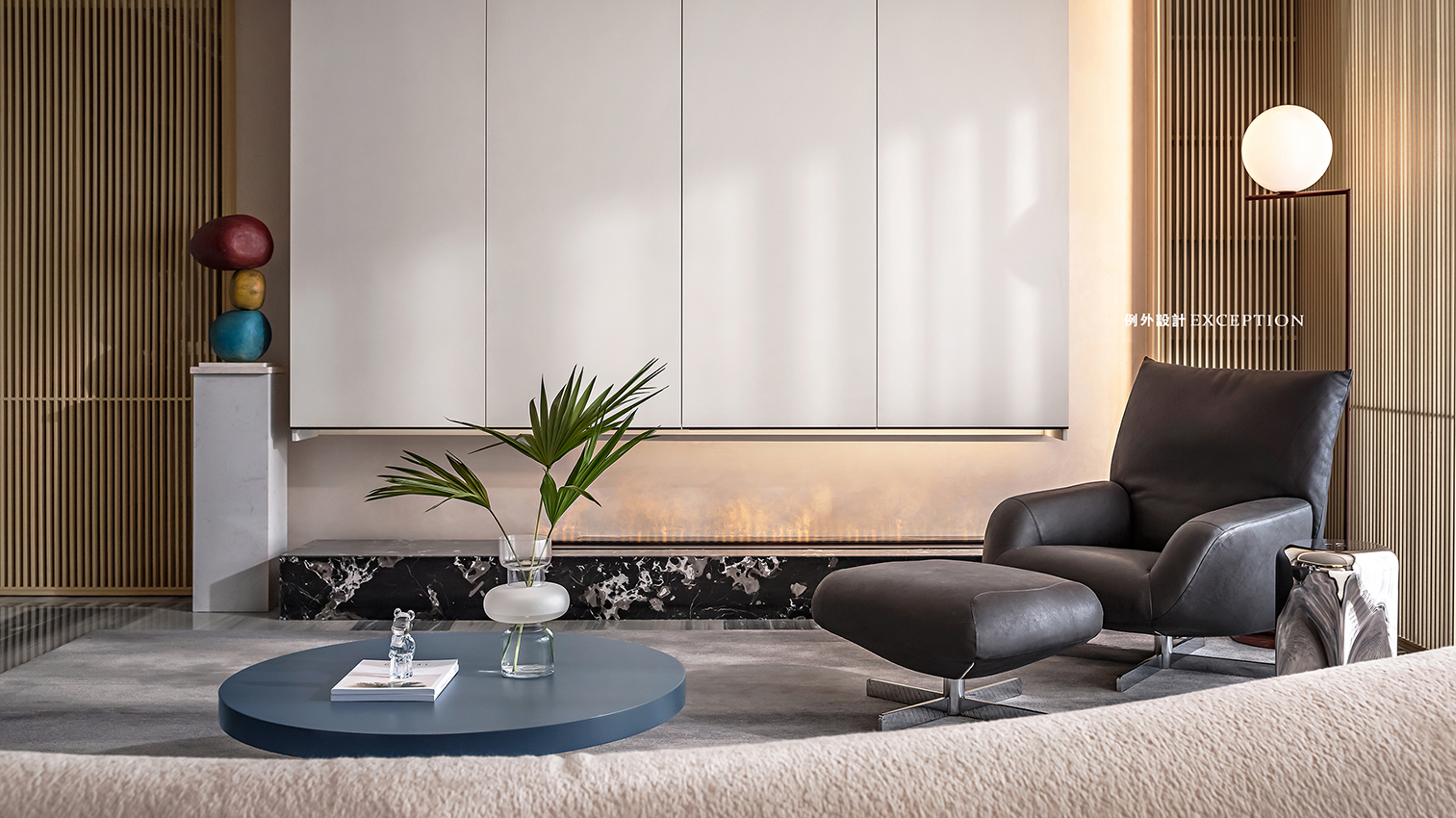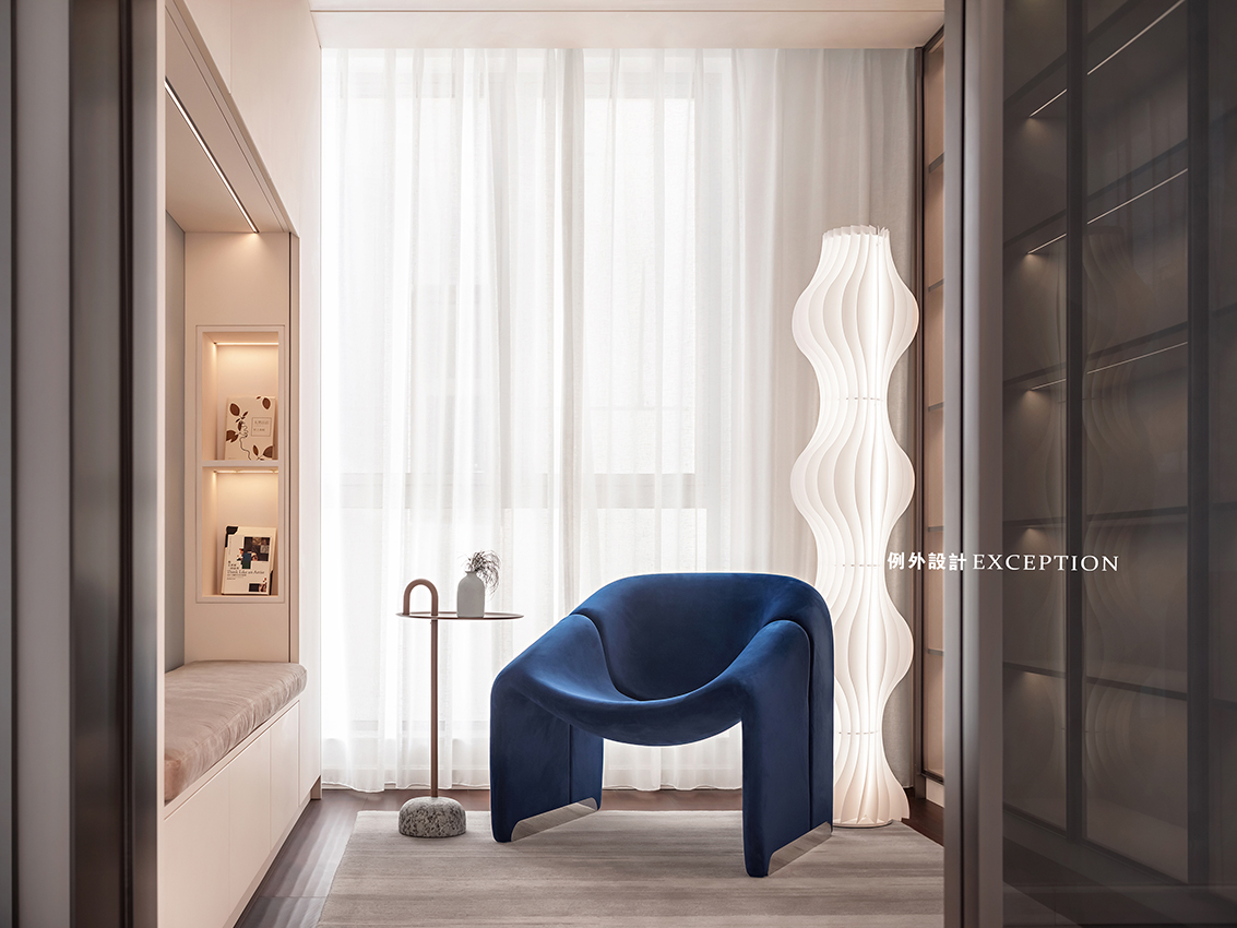 當滿目海景遇上懂生活的人,空間的故事又多了一層韻味。雙向而立的沙發成為客廳和書房功能的鏈接,創造出更加豐富的生活場景。家人可以一起看電影、紀錄片,一旁的閱讀區也是放松身心的不錯選擇,或者在單人椅側目而望,光影與自然,人情與況味,在這里靜靜交織。