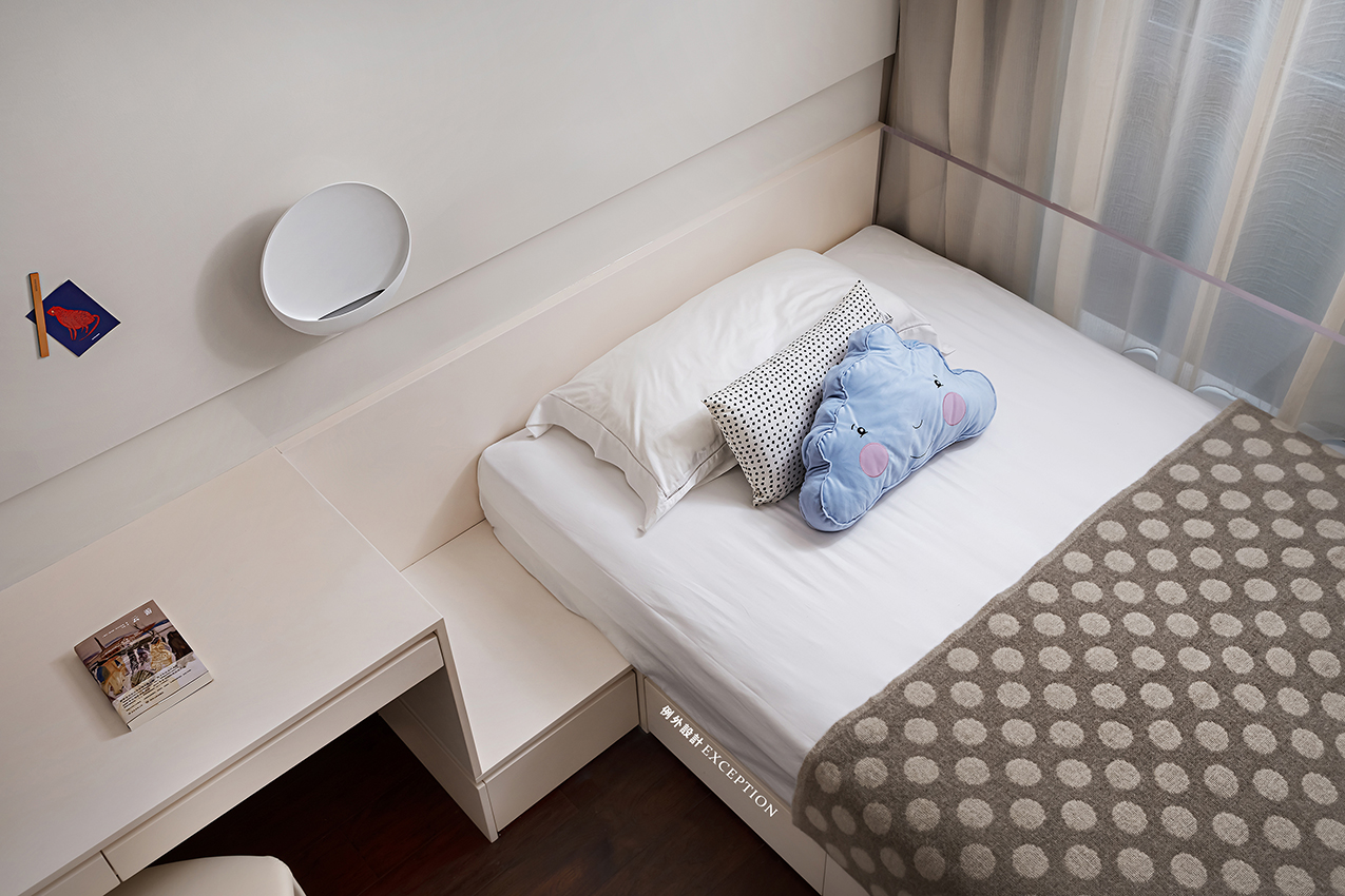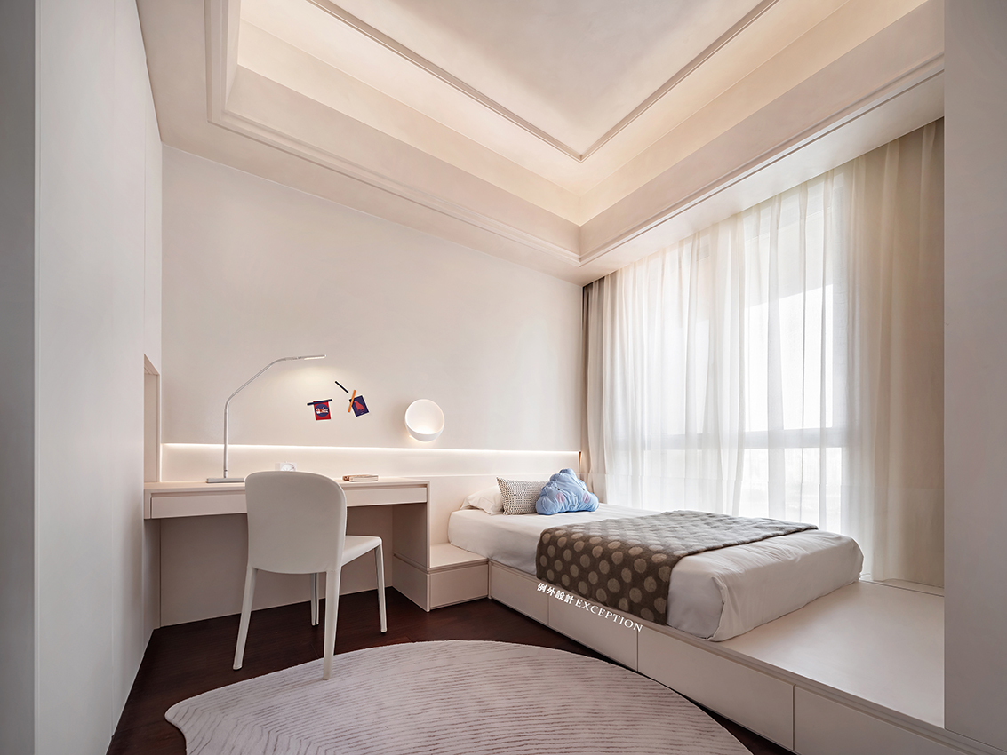 清晨的陽光溫煦明媚,是大自然對人類永不停歇的福澤,讓人滿懷希望去奔赴、熱愛。臥室是孩子成長的庇護所,良好的觀景視野是他創想可以抵達的遠方,柔和的色彩也為小小的個人天地預設了溫暖純澈的方向。