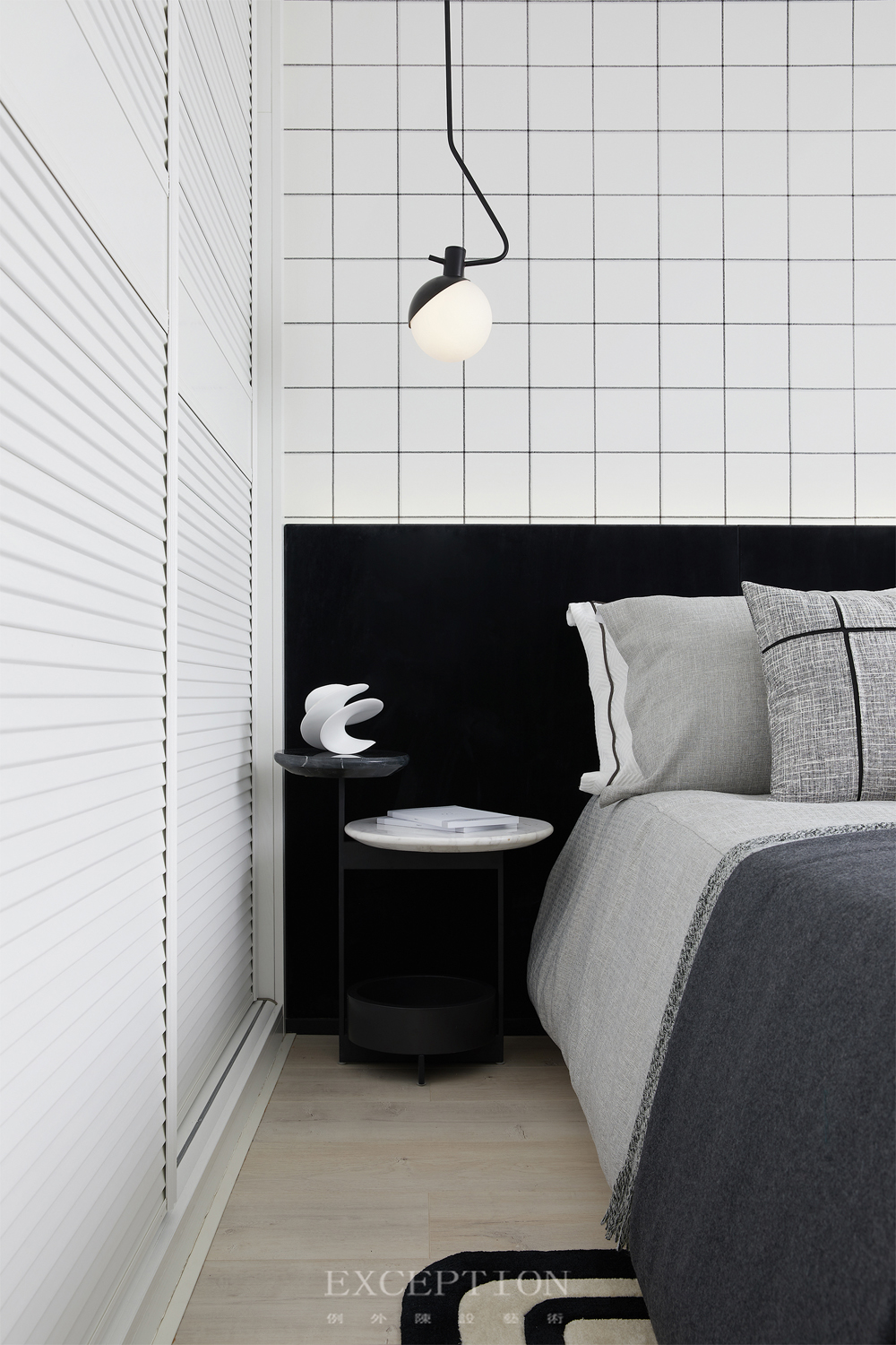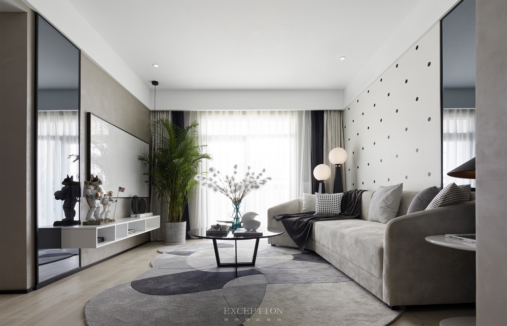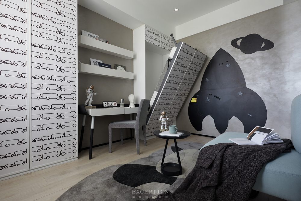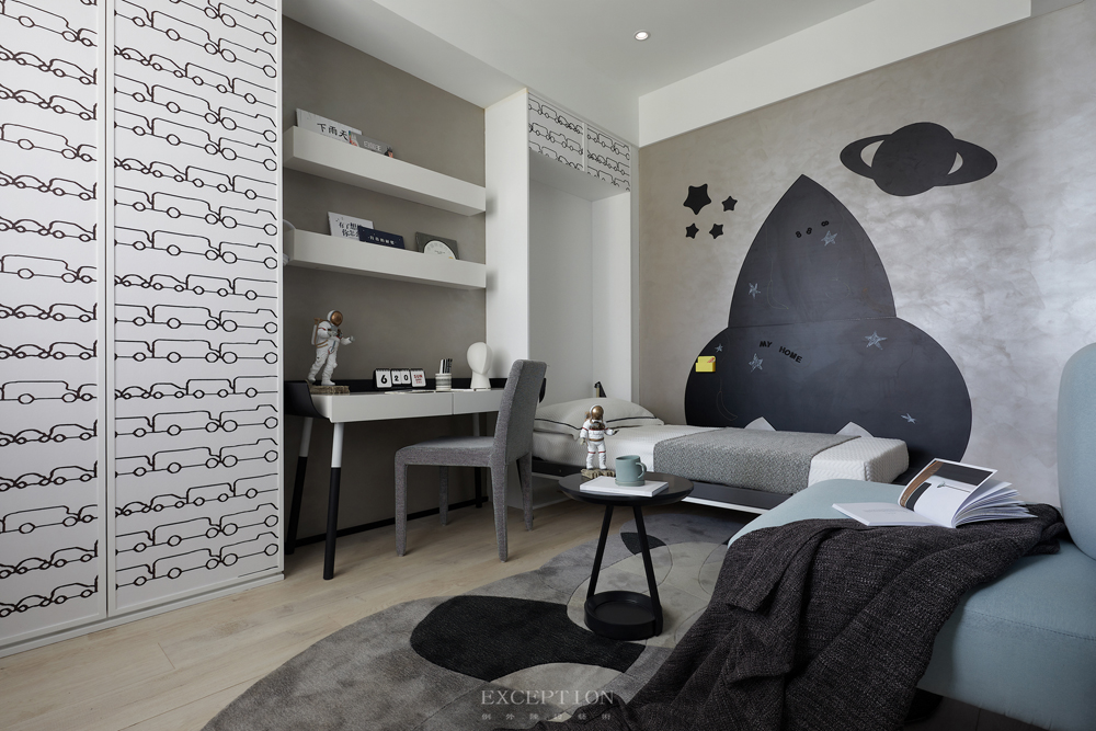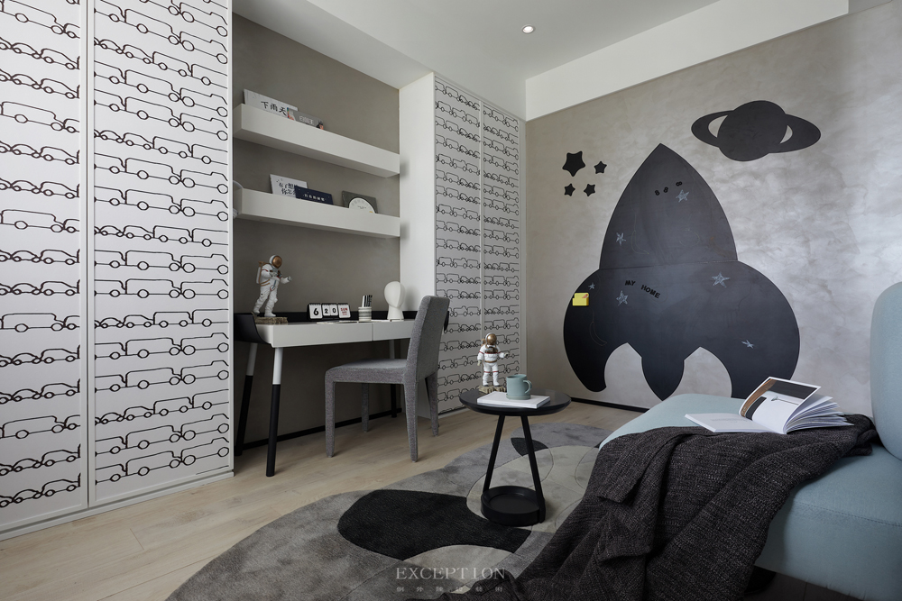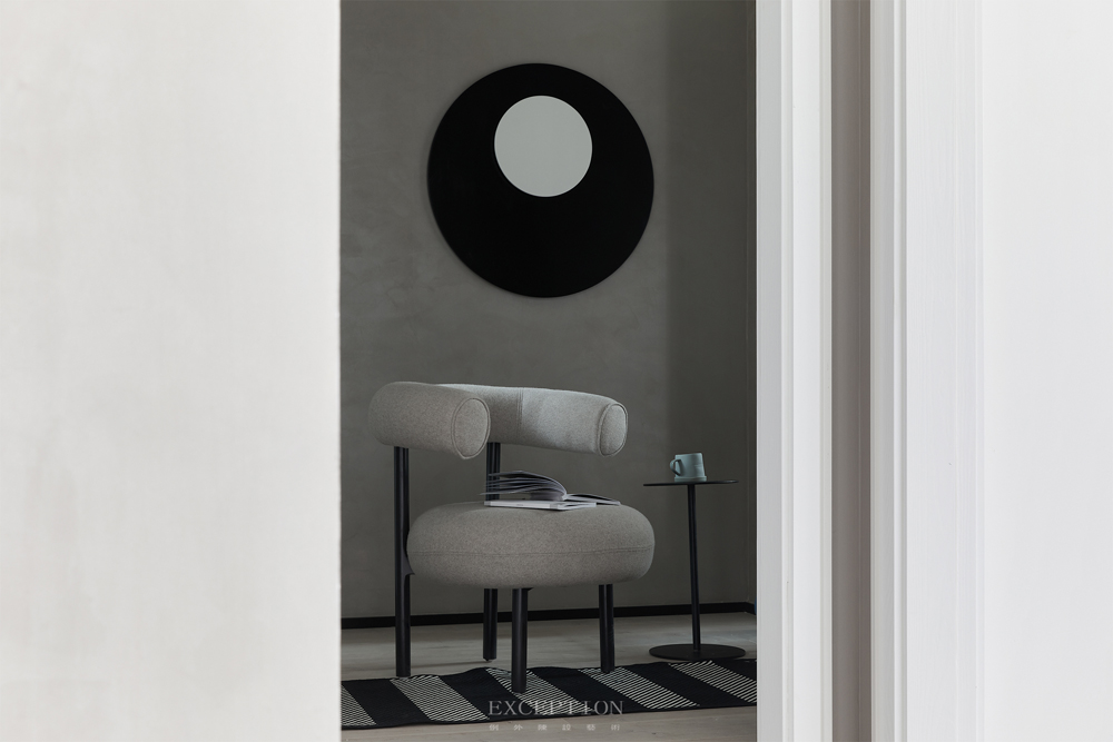 在這套項目的設計中,靈感源于電影《流浪地球》,通過黑白灰色系及科技感十足的元素來強化空間的個性;多變的幾何線條、拼接重疊的純凈色塊與輕靈的亞克力、網格等材質糅合交加,抽象表現出藝術的多重思維與多元意境,與年輕人樂于探索、傾向新潮的生活態度不謀而合。