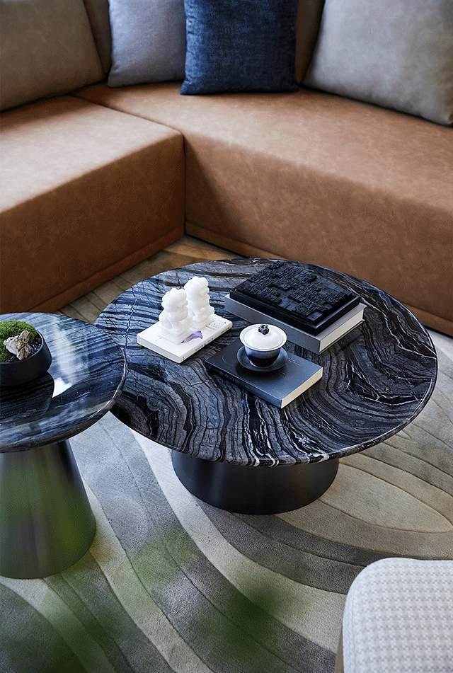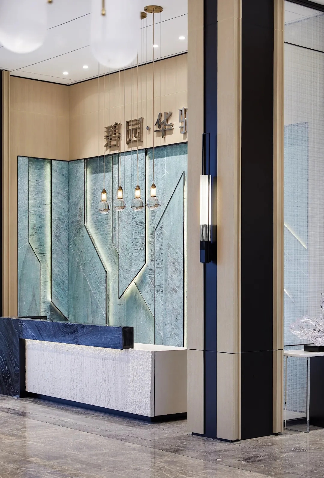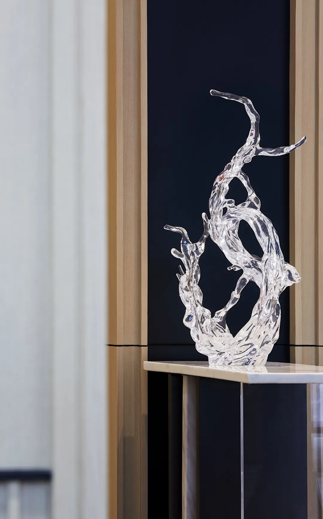宛如湖景的碧色,與幾何線條的錯落鋪排相融相生。一旁裝點的玻璃藝術品,以水花的柔美卓姿,寫意清透雅澹的意韻。空間在自然人文語素與現代極簡形制的融合中,剛柔并蓄。