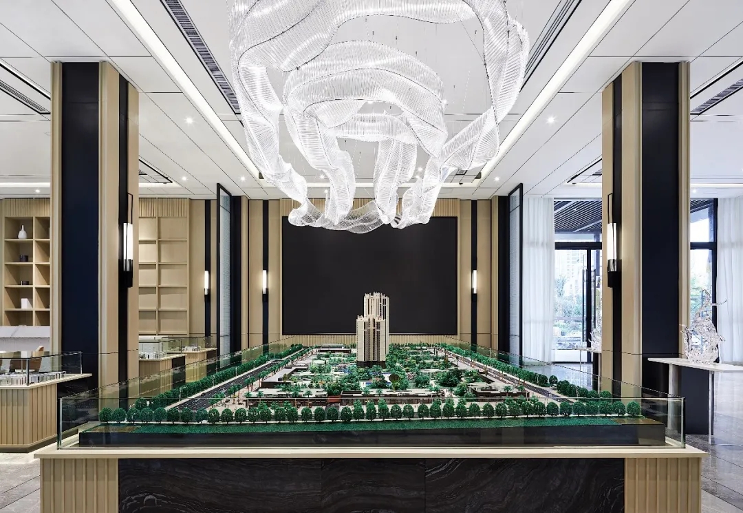 沙盤區的藝術吊燈,如云霧落入空間,又似漣漪圈圈散開,設計以現代手法演繹出山川自然的曠遠與靈性、清幽與意趣,恰有一番“夫唯不爭,而眾美紛至沓來”的祥和靜氣之感。