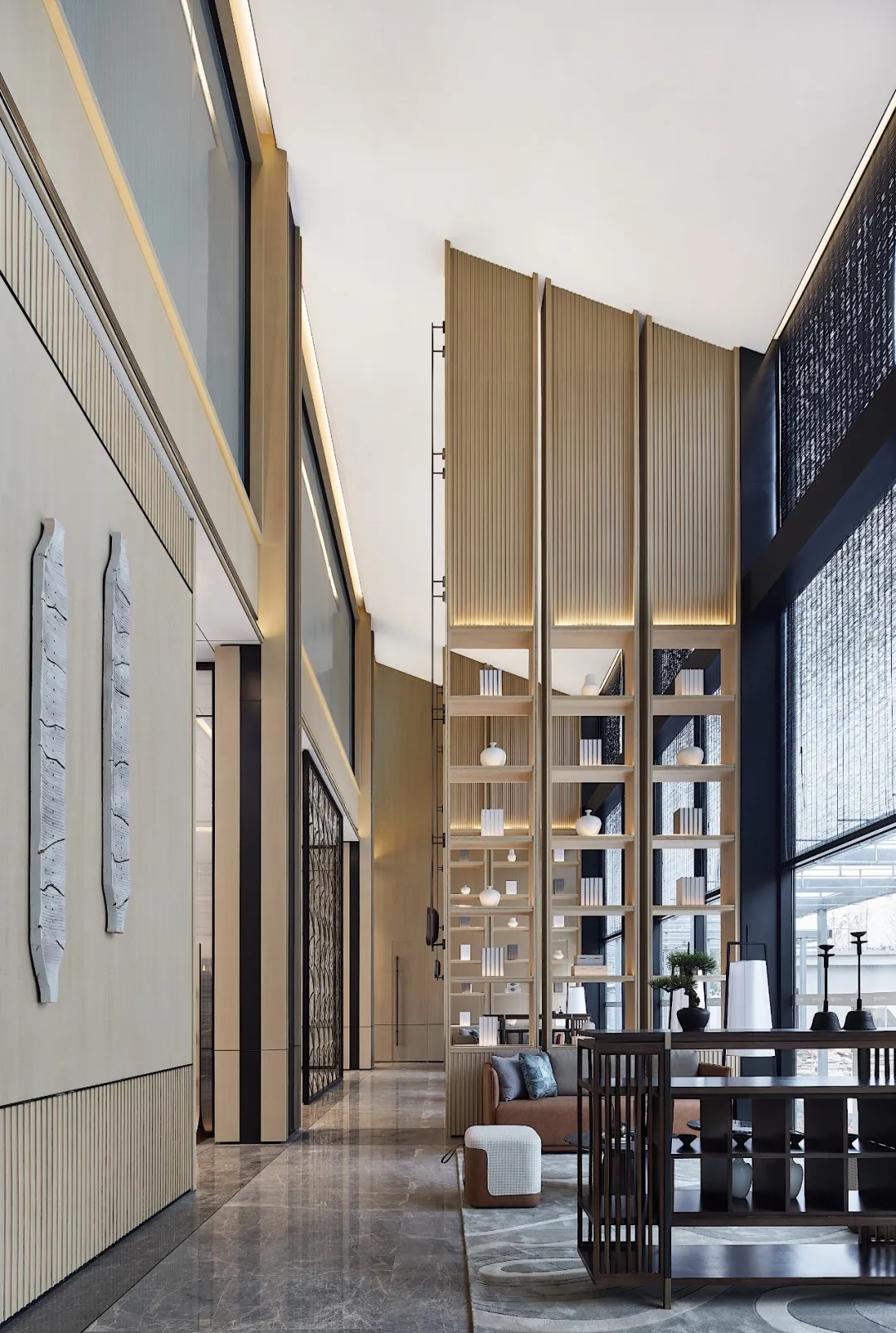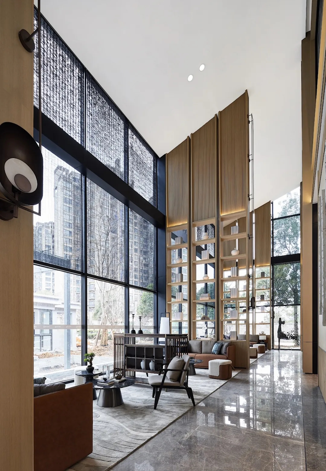 設計以暖調的木色統籌,縈繞其間的氛圍是美好而富有溫情的。墻上的掛件如扁舟淌水,窗旁的雨簾疏密有致,通高的木制書架銜接建筑天花形態,縱向拉伸視覺效果。在這方雅座上沏杯清茶迎接來客,一同感受高雅曠達的自然人文情感。
