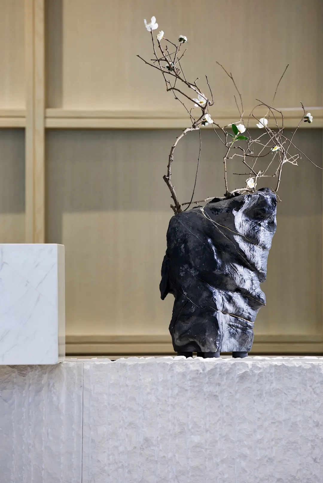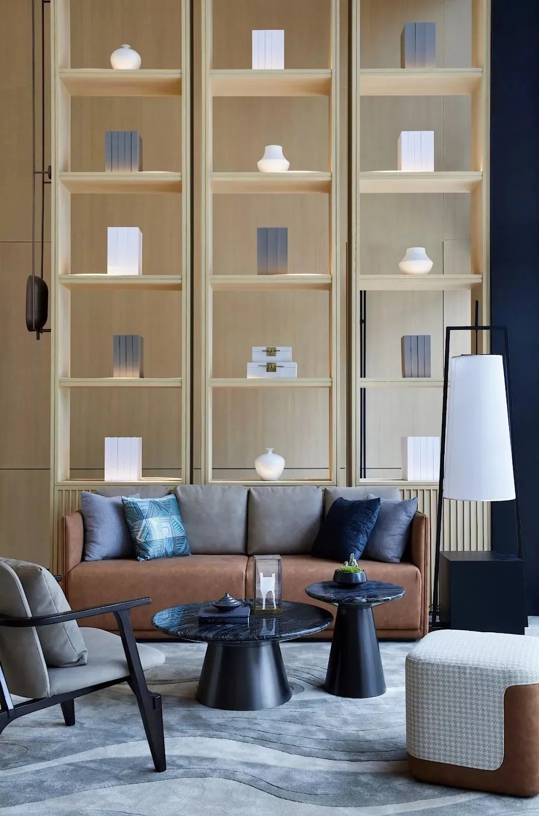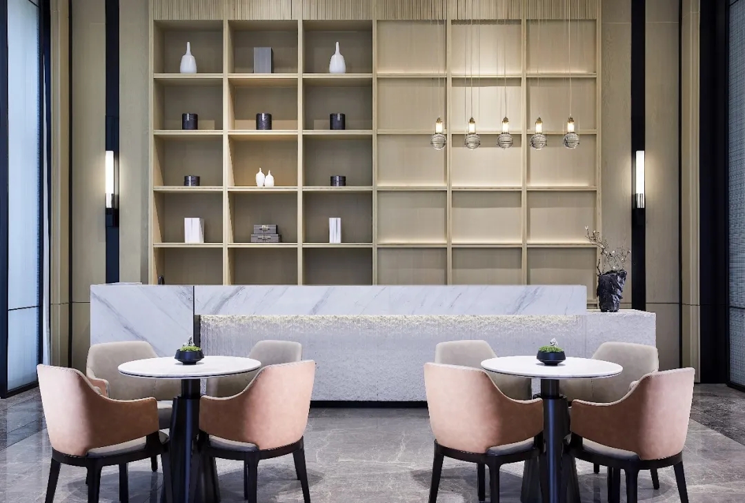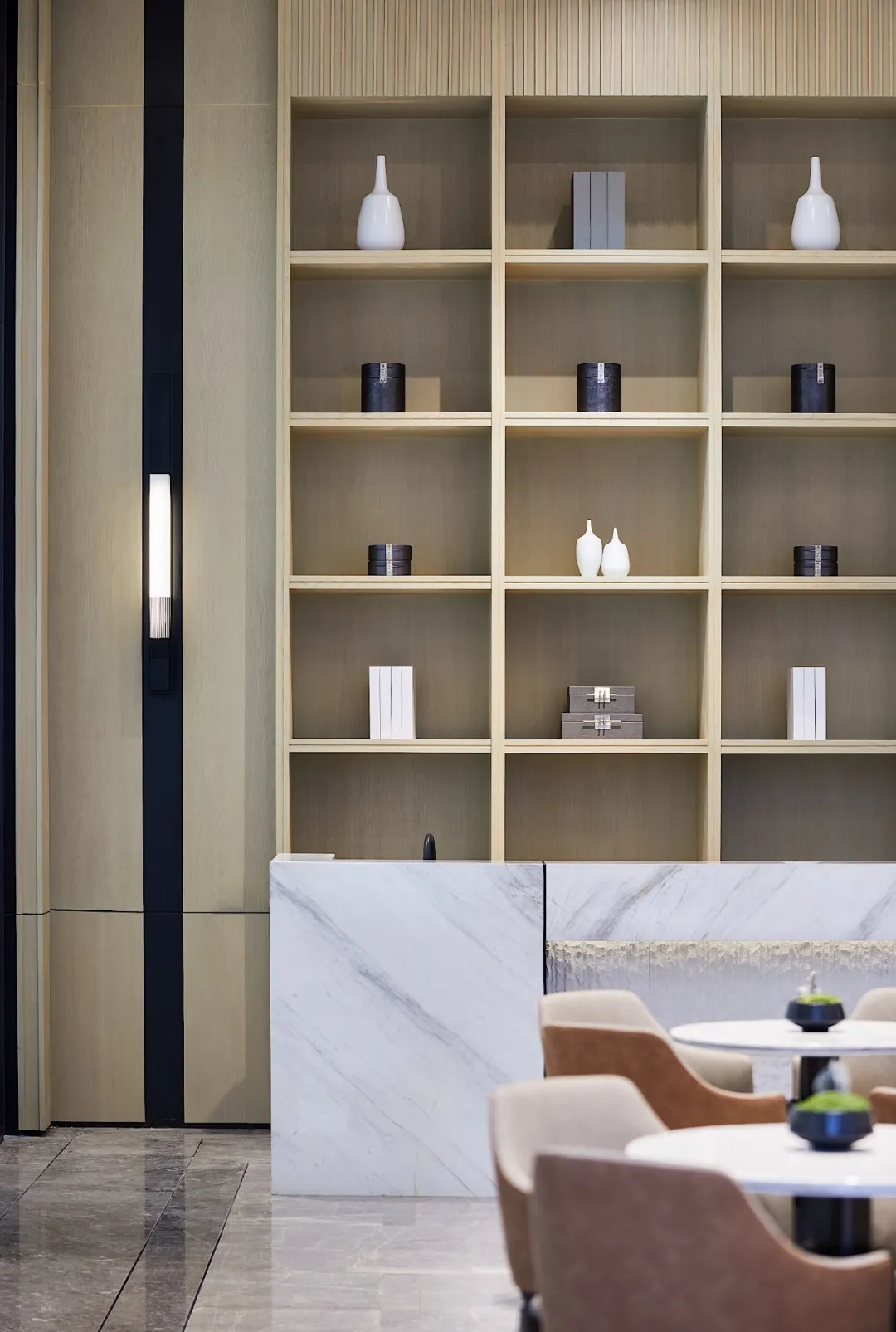 水吧區以粗糲與光滑相銜的材料搭建,材料豐富的表現力與層次感,在簡雅的環境背景中被發揮到了極致。基于空間比例、功能使用、美學營造等考慮,鴻藝源在設計中規避不必要的繁冗雜飾,只以數只清雅的瓶樽、輕盈的水晶吊燈與清冽的小處盆景裝點,恰如這座城市予人的感覺一般,含蓄悠遠,閑適怡人。