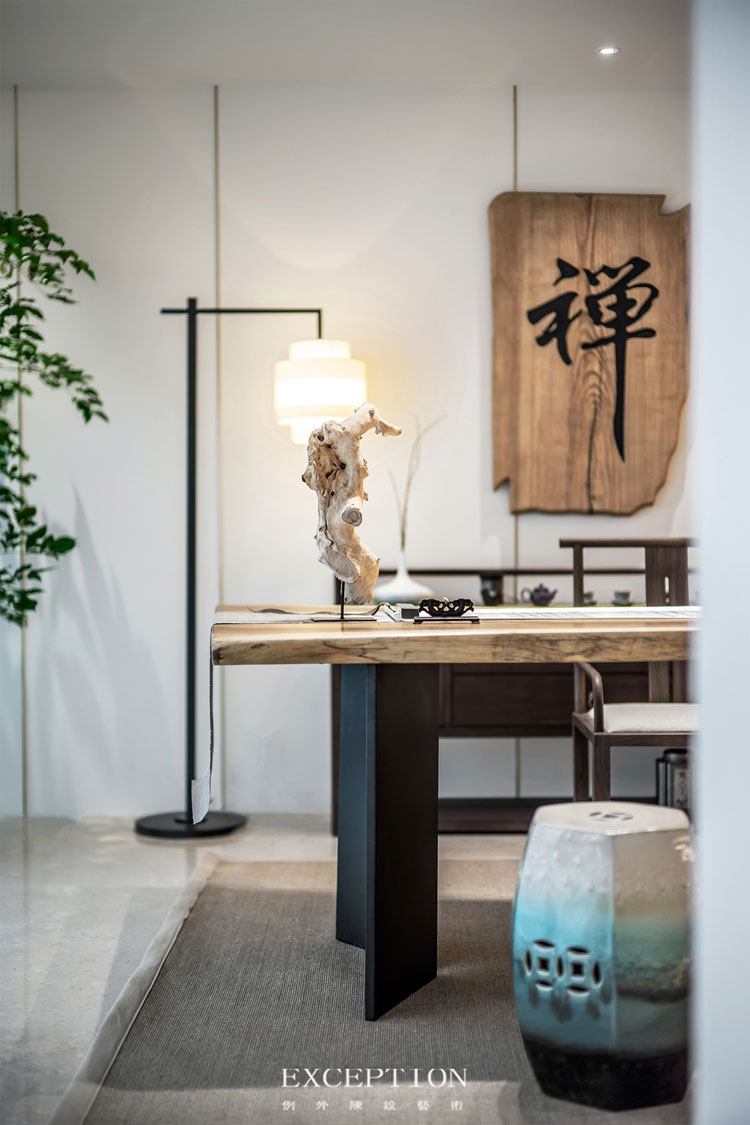 除了精心打造出習字、品茶的閑適意境、空間沒有多余的修飾,纖秀線條框畫的白墻,空濛煙雨霽月藍的鼓凳,木飾掛件年輪,圈出禪意的心境與變遷,無形之中將東方的氣韻植入空間中,所有的設計與陳設都是設計師在對居者生活方式及喜好的審度后進行的選擇,既不失美感,又兼具人文氣息。