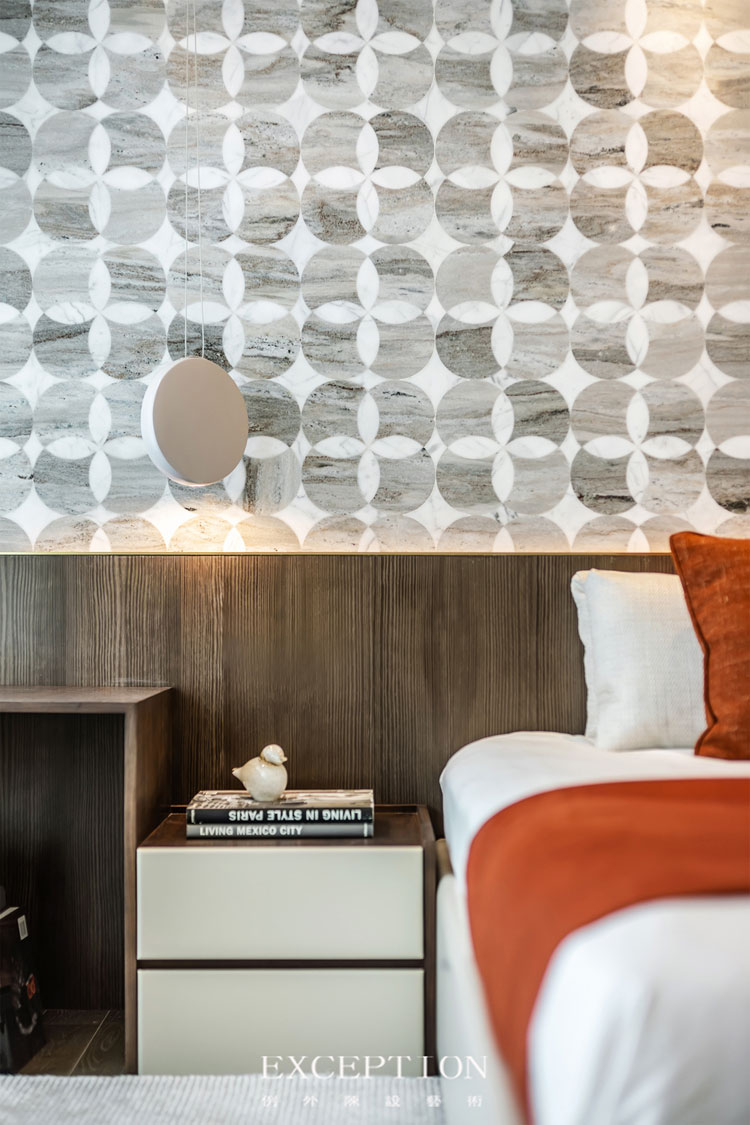主臥繼續(xù)回歸靜謐淡雅的路線,閑時可引清風作伴,以書為媒去探求未知的精神境界。窗邊床頭背景,延續(xù)客廳的紋飾,重疊往復,似一首經典曲調的副歌部分,在一遍又一遍之中找尋到空間的韻律感。床頭柜拒絕了對稱的展示,而是定制大小不一的柜體讓空間得到合理的利用,線條利落而干凈,牽引出最個性的空間氛圍。