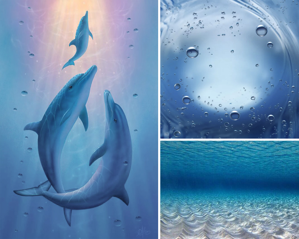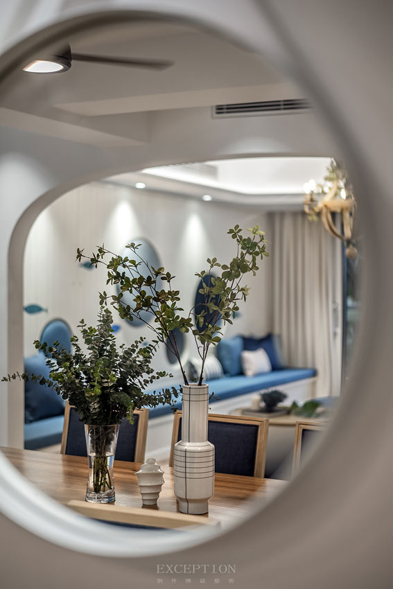 透過餐廳墻上的裝飾鏡,可以瞥見客廳的一角。就像暢游在奇趣無窮的海底世界,餐桌上的綠植是搖曳舞動的海草,客廳墻上的游魚在穿行,就連鏡子也可以是晶瑩的泡泡。有時候換一種角度,用孩童般的好奇心創造直觀化的感受,以視覺韻律書寫海洋情懷。