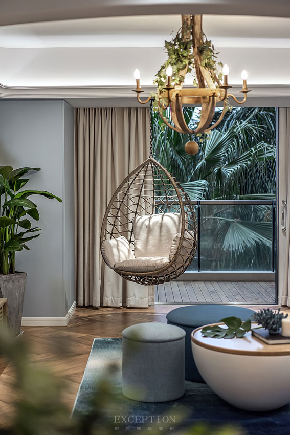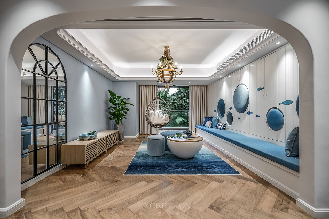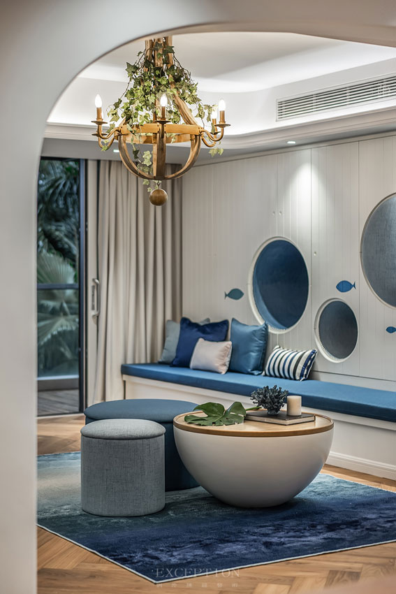 在鴻藝源設計的室內設計基礎之上,我們結合業主的想法和現有的硬裝環境,以藍色為主,選取海洋、植物元素來強化空間的休閑和趣味性,打造一個互動性強的趣味空間。