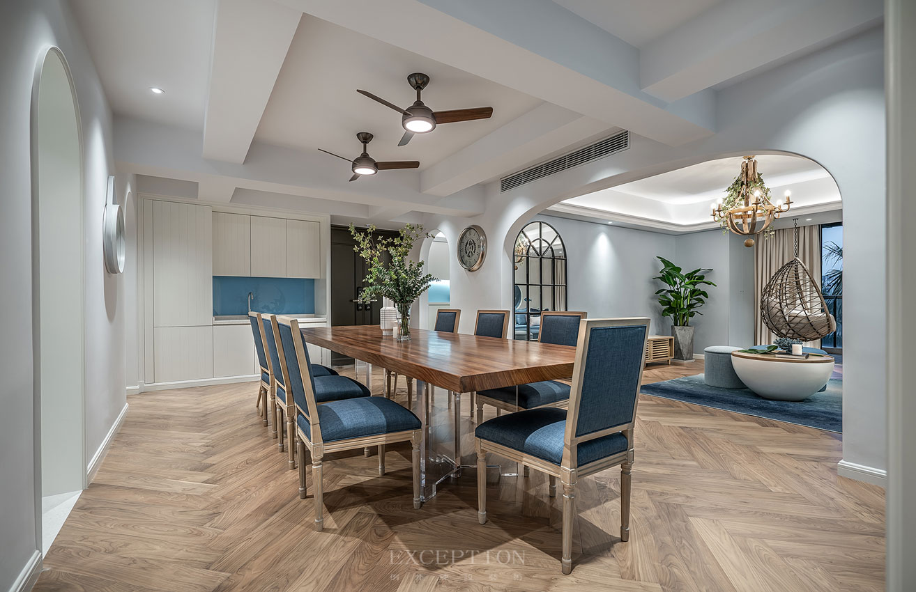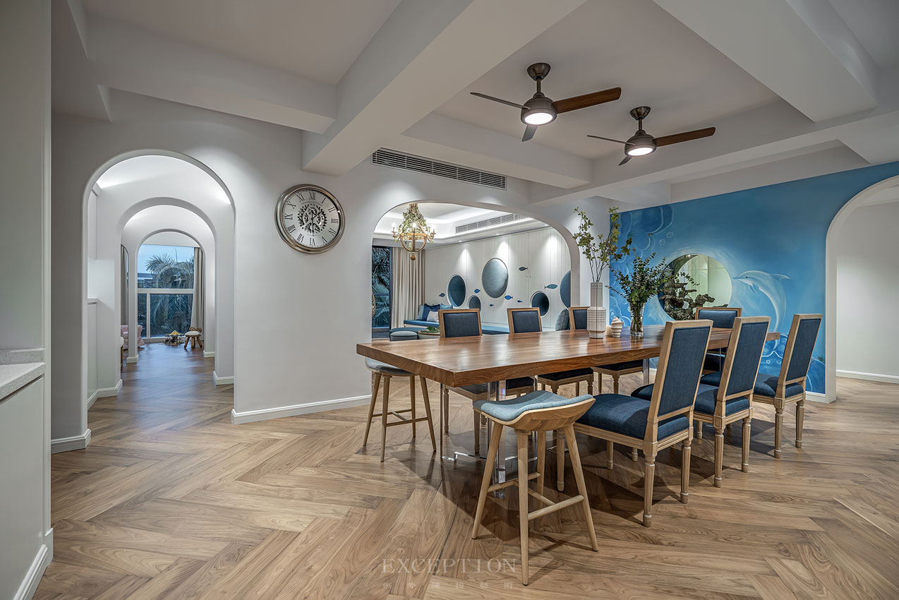 實木餐椅與海藍色完美糅合,風扇燈葉擺動,耳畔似有溫柔的海風呢喃,音樂聲起,美食美酒演繹浪漫晚餐旋律。
