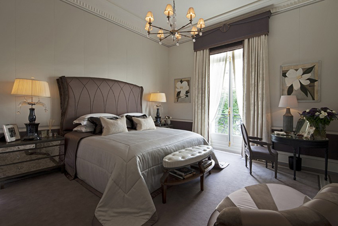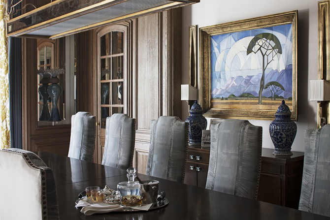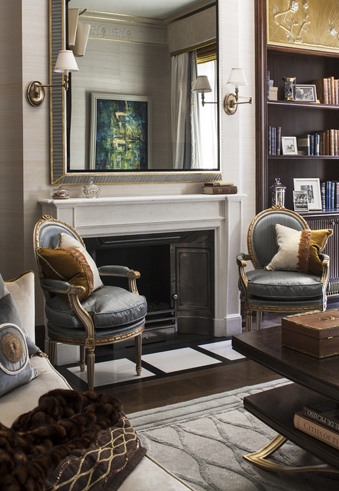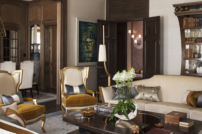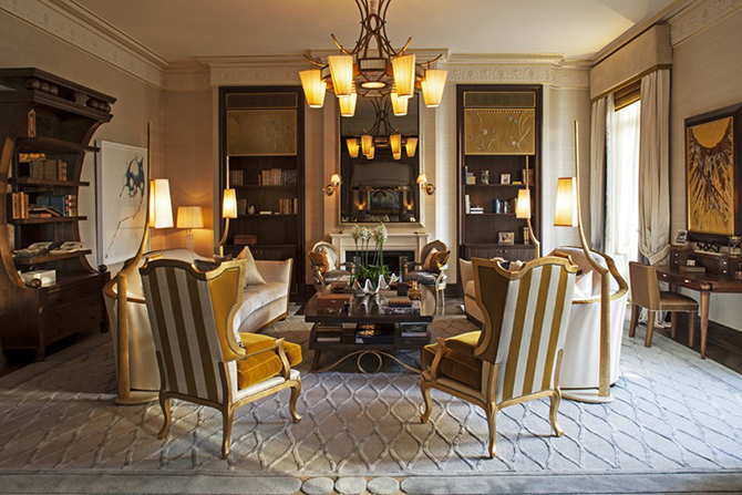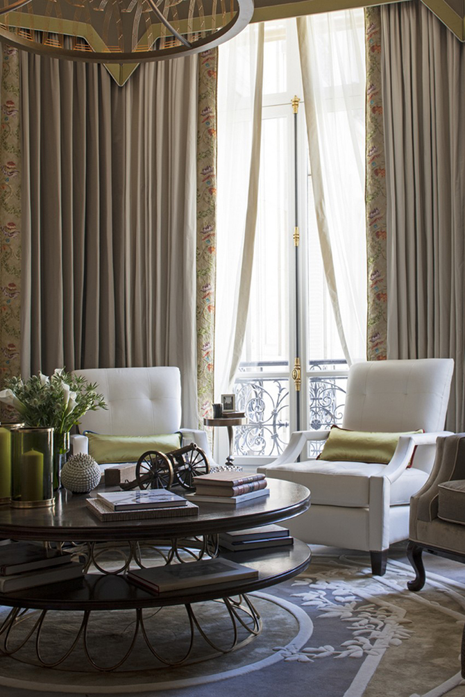 無論是家具還是地毯、枝形吊燈還是真絲墻紙上的圖案,全部都是以高規格量身定制。這是一套帶套房的臥室、客房和傭人房的大公寓,這里既體現了法式的傳統優雅,又融入了現代時尚的裝修風格,設計師將這兩點和諧共生。這間公寓引人注目的特點或許是走廊里那個受到巴黎新藝術啟發而制成的孔雀羽毛玻璃板。設計師花了一年時間來尋找他中意的材質,終發現只有這種材質才能精準地表達出他想表現的那種意思。其他亮點也不勝枚舉,手繪真絲墻紙材質特別,在自然光線的照射下反射出柔美的光暈。
