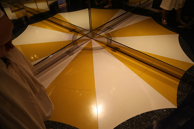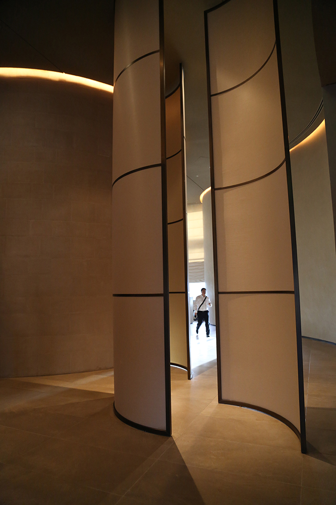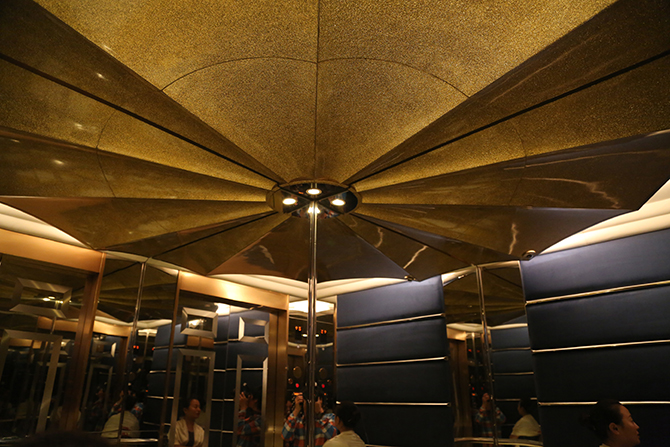 電梯的設計簡單卻不乏創意:其實看似完整的圓其實是只有四分之一的,經過鏡面反射便成了一個完整的圓。