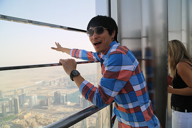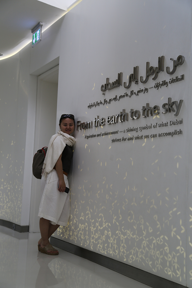 《碟中諜4》的場景還歷歷在目,眼看到哈利法塔的時候,便在各個地方尋早阿湯哥的足跡。這就是造價達15億美元、828米高的世界高樓與人工構造物。其實它的建築結構是很單一的,由多個管狀的塔組成的。這裡有世界上快的電梯,據說速度高可達17.4米/秒,我們還特意計時,從1樓到123樓觀景臺,大致用了56-57秒,大致一秒鐘2層多,感覺還沒反應過來已經到了目的地,太不敢置信。