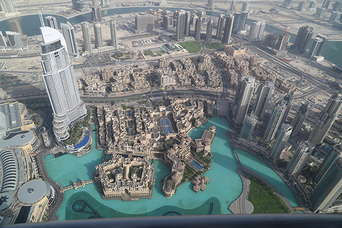 迪拜俯瞰圖:森藍色的那片水域是水上音樂廳,據說是世界上噴的高的音樂噴泉,不過還要等到晚上才能一睹芳容。