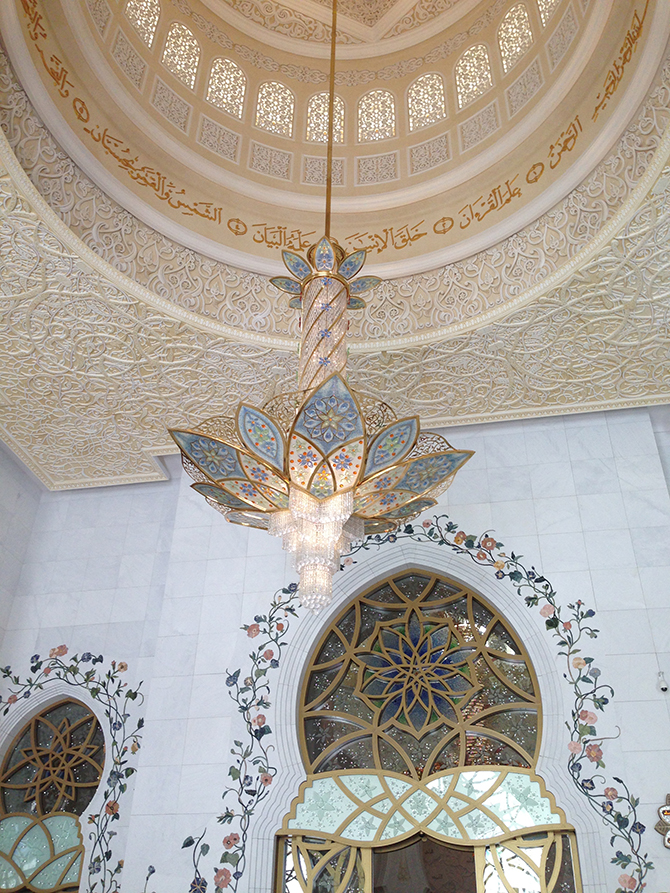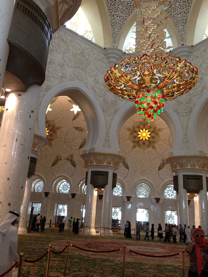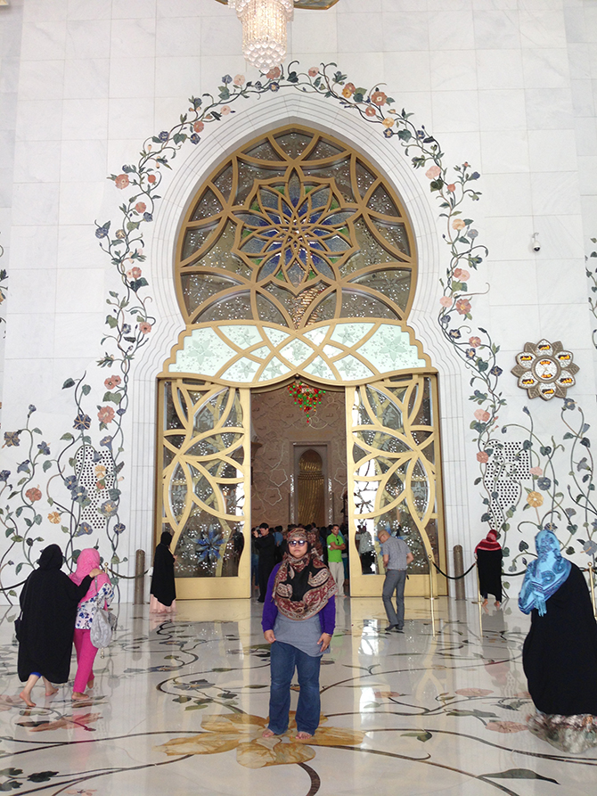 15日上午,我們驅車2個小時到了阿聯酋大城市——阿布達比,來到伊斯蘭國家自然不能錯過宏偉的大清真寺,宏偉的清真寺為聖潔雪白的大理石鑄就而成,一下車,那恢弘、肅穆的氣氛頓時攝人心魂,之前激動的我們也噤聲不語。進入寺內走廊,一排排白玉柱上鑲嵌著各種美麗的圖案,柱子頂端也是包金雕刻而成,更加彰顯皇家的氣派!
