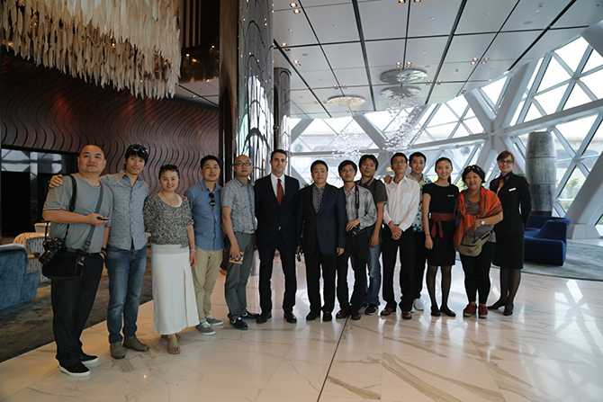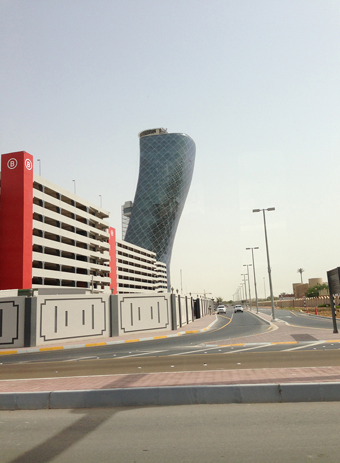 阿布達比之行即將結束的時候,組委會突然告訴我們一個驚喜——參觀阿布達比凱悅酒店。這座具有視覺震撼力的大樓在建設上採用了世界先進的建築技術,向西傾斜度達到驚人的18度,創造了吉尼斯“世界上斜的人造塔”紀錄。