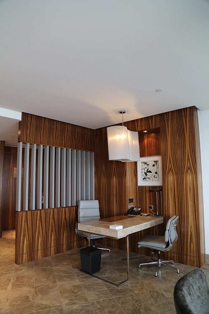 喬治·阿瑪尼對於色彩的把握非常到位,不多的幾個顏色卻把空間裝飾的美輪美奐。隱蔽措施做得很好,推拉門和木質牆面巧妙銜接,甚至連插座、冰箱等都是暗藏在櫃子裡的,這是阿瑪尼保持整體的整潔優雅的一大奧妙。