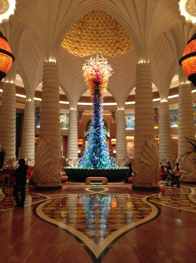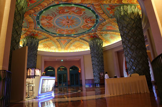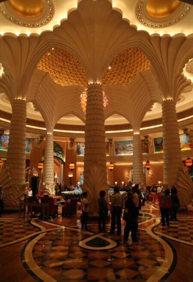 亞特蘭蒂斯酒店耗資15億美元興建,坐落阿聯酋迪拜的棕櫚人工島上,占地113畝,有1539個房間,如同古波斯和古巴比倫建築裝潢風貌。