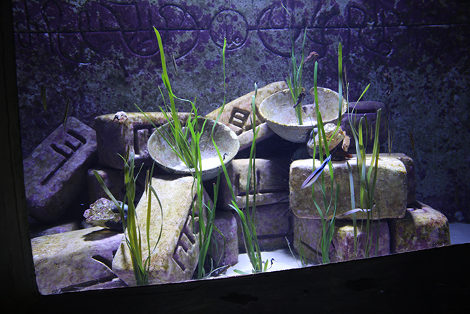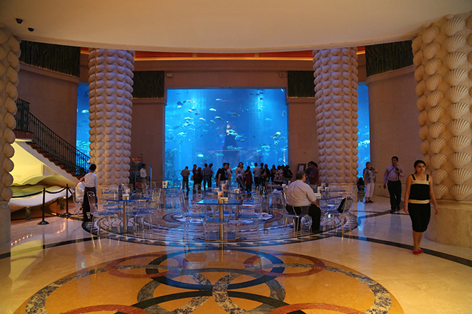 酒店內還有一座高達數米的水族箱,色彩斑斕的熱帶魚群在海水中自在遊弋。水族箱背景則是傳說中的沉陷的亞特蘭蒂斯廢墟,斷柱殘垣,及史前文明的飛船碎片點出了酒店的主題,也使這個水族館有區別于一般海洋館的科普特徵而有了文化和歷史感。